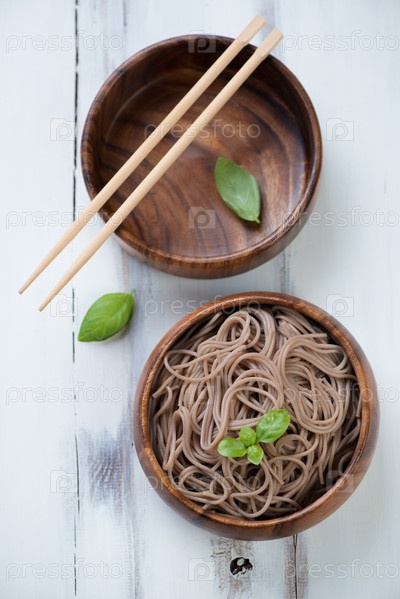 Вареная лапша соба в деревянной миске