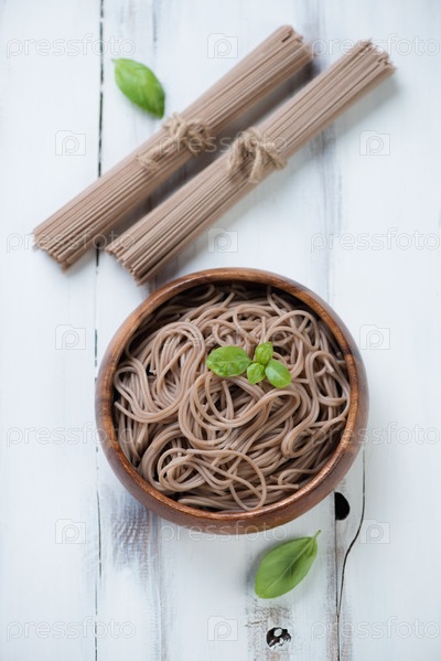 Вареная лапша соба в деревянной миске