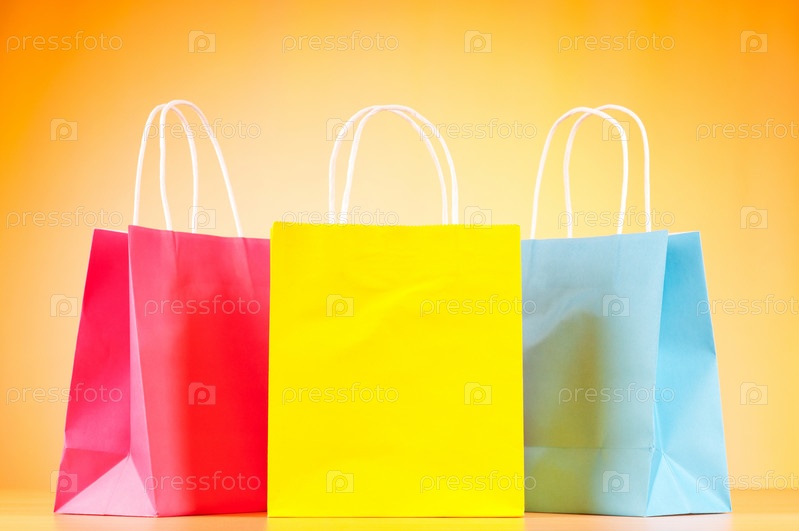 Яркие бумажные пакеты на оранжевом фоне