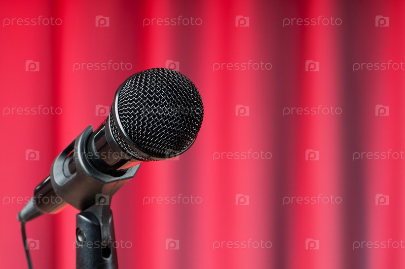 Микрофон в стойке на фоне красных штор