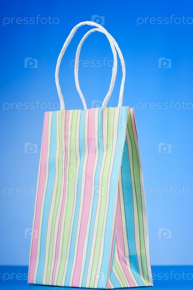 Полосатый бумажный пакет крупным планом на голубом фоне