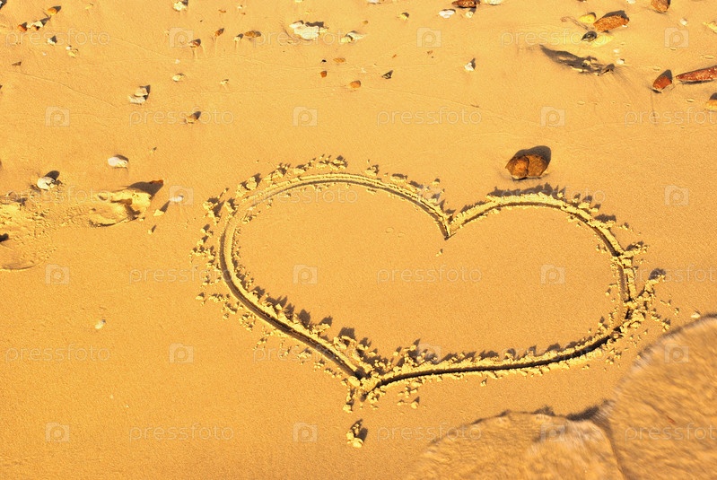Одно сердце написано на песке на пляже моря