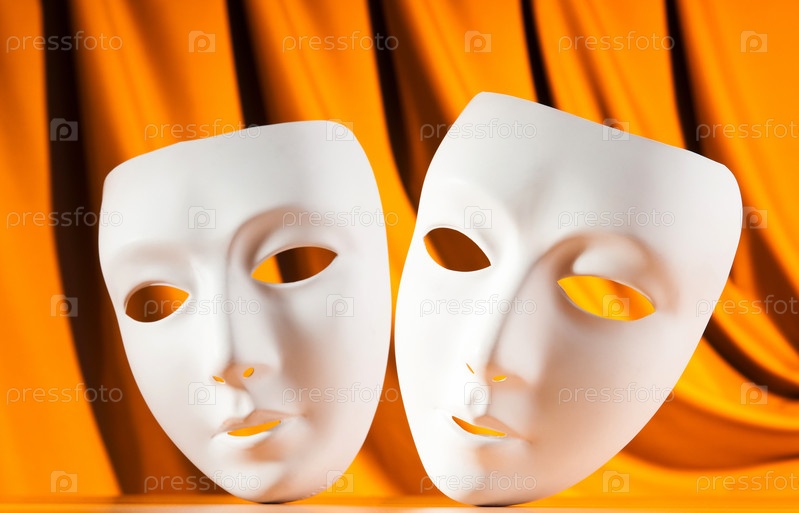Две белые театральные маски крупным планом на оранжевом фоне