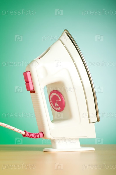 Белый утюг на столе на фоне зеленого цвета