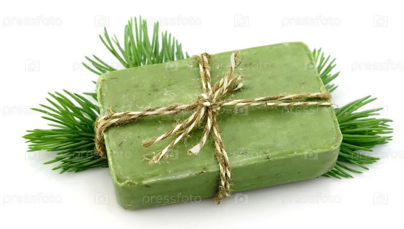 Мыло с еловыми иголками на белом фоне