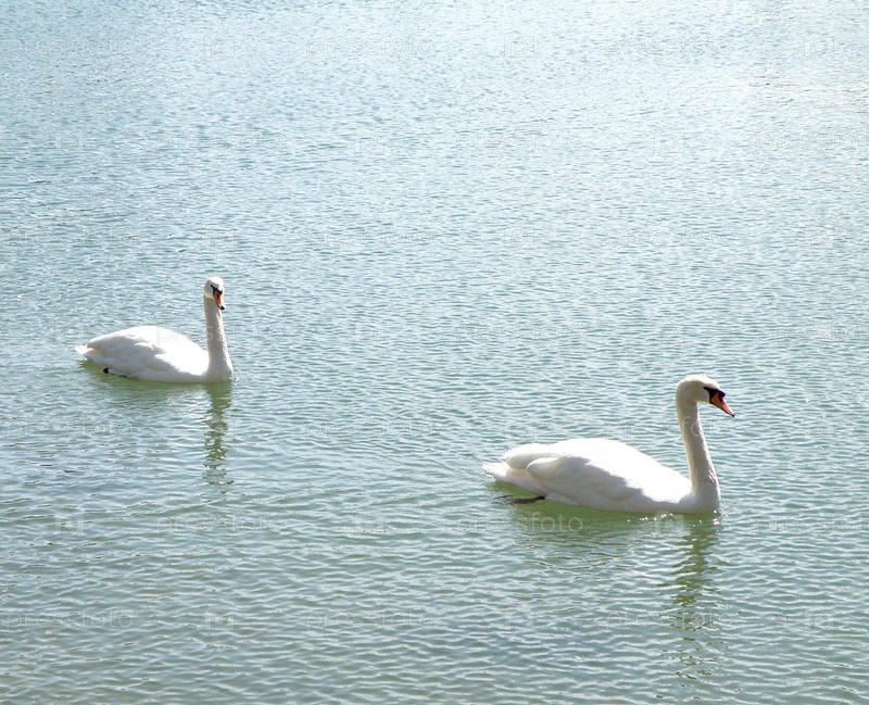 Два белых лебедя, плывущих по озеру