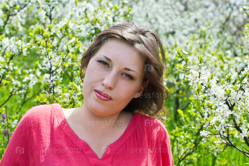 Портрет молодой красивой девушки на фоне цветущих деревьев