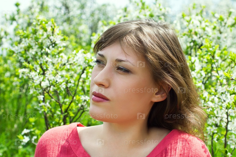 Портрет молодой красивой девушки на фоне цветущих деревьев