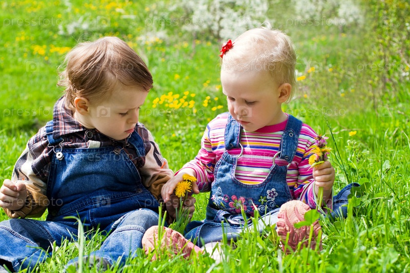 Маленькие мальчик и девочка, сидящие в траве