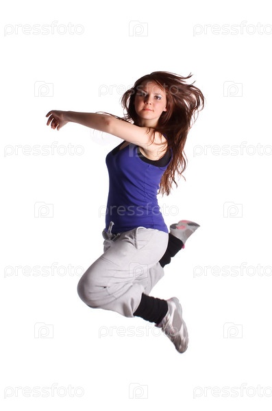Девушка в прыжке на белом фоне