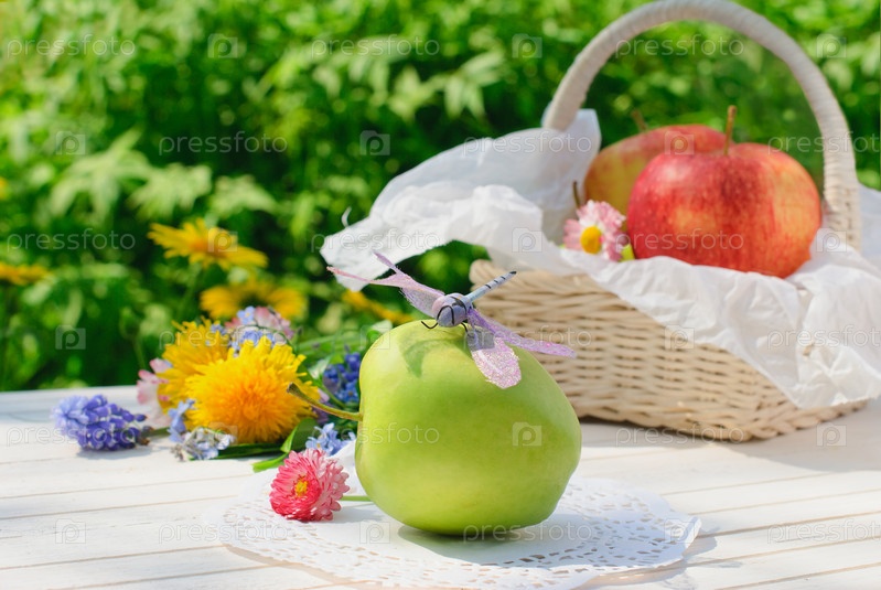 Корзинка с яблоками, цветы и яблоко с декоративной стрекозой