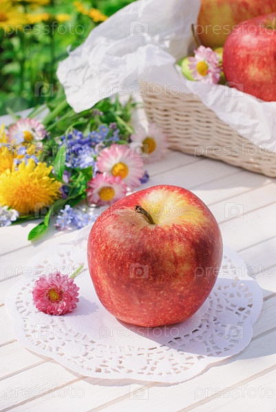 Корзинка с яблоками, цветы и яблоко на салфетке