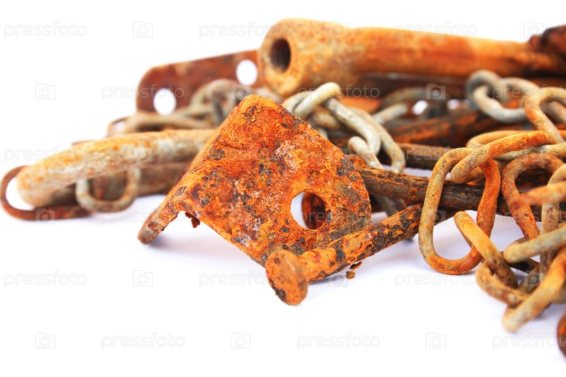 Ржавые гвозди и цепи на белом фоне