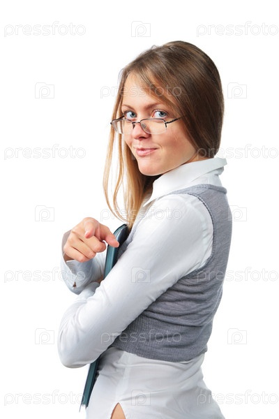 Девушка с папкой документов указывает пальцем в камеру