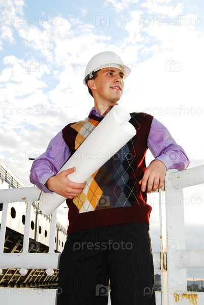 Молодой инженер с чертежом стоит на мосту
