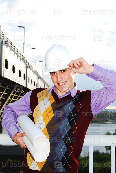 Молодой инженер с чертежом стоит на мосту