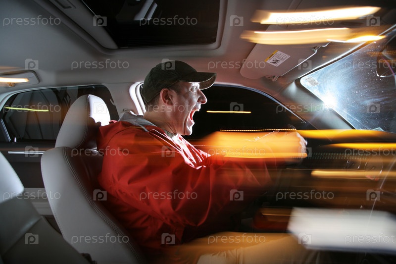 Водитель кричит за рулем автомобиля на большой скорости в ночное время