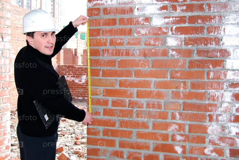Строитель измеряет стену рулеткой