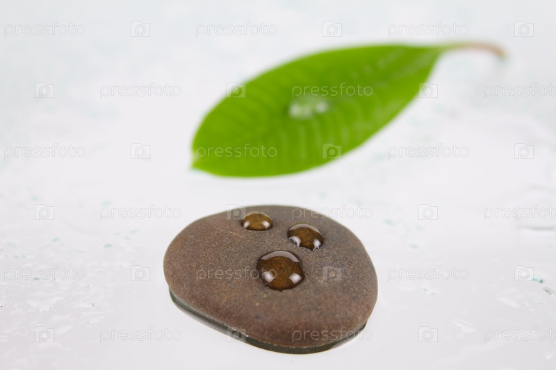 Камень для спа-салона с тремя каплями на мокрое стекло, удаленное близко к зеленому листу