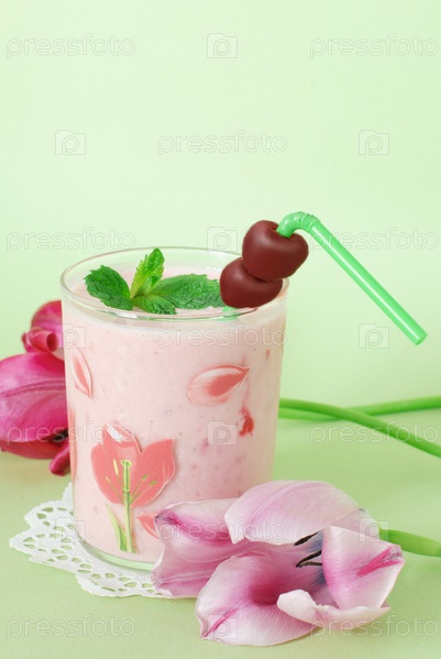 Молочный коктейль с вишенками на зеленом фоне с тюльпанами