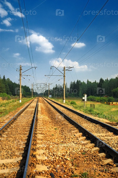 Старые железнодорожные пути стальной стали с отражением под бкуим небом и облаками