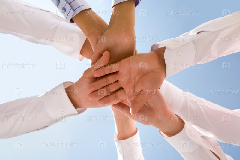 Нижний вид людей, держащих друг друга за руки на фоне неба