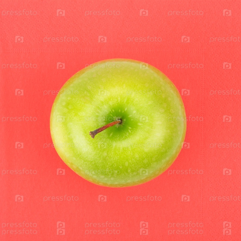 Зеленое яблоко на красном фоне