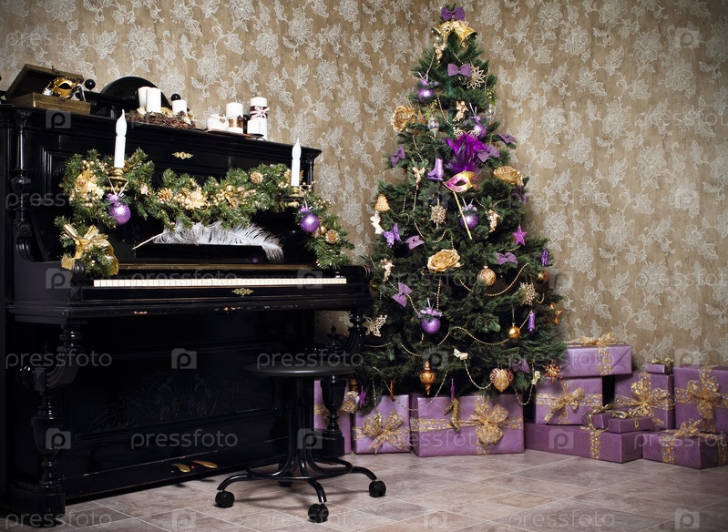 Фортепиано, рождественская елка, свечи и подарки в комнате