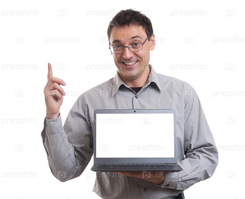 Мужчина рекламирует ноутбук