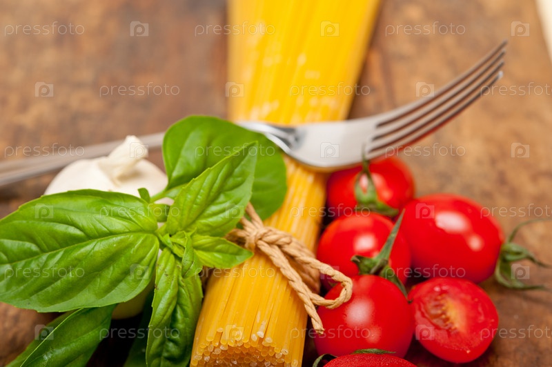 Спагетти, помидоры и базилик