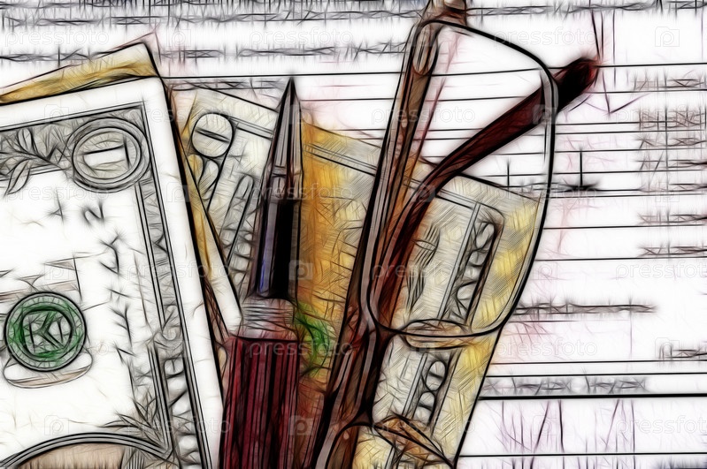 Очки, ручка, доллары и графики на столе