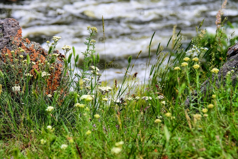 Полевые цветы на фоне быстрой реки