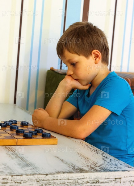 Задумчивый мальчик во время игры в шашки