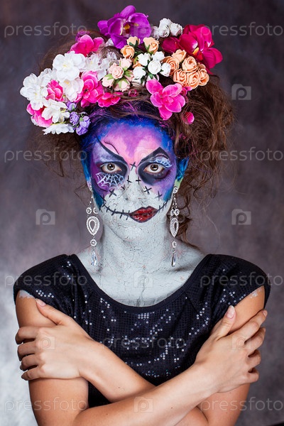 молодая девушка фейс-арт хэллоуин ужас страх праздник цветы