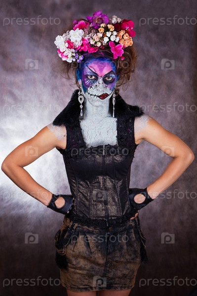 молодая девушка фейс-арт хэллоуин ужас страх праздник цветы