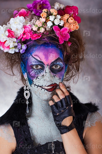 молодая девушка фейс-арт хэллоуин ужас страх праздник цветы