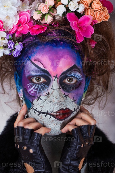 молодая девушка фейс-арт хэллоуин ужас страх праздник цветы