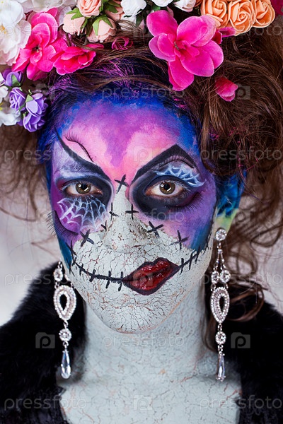 молодая девушка фейс-арт хэллоуин ужас страх праздник цветы
