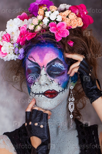молодая девушка фейс-арт хэллоуин ужас страх праздник цветы