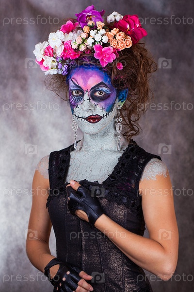 молодая девушка фейс-арт хэллоуин ужас страх праздник цветы