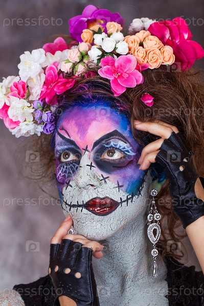 молодая девушка фейс-арт хэллоуин ужас страх праздник цветы