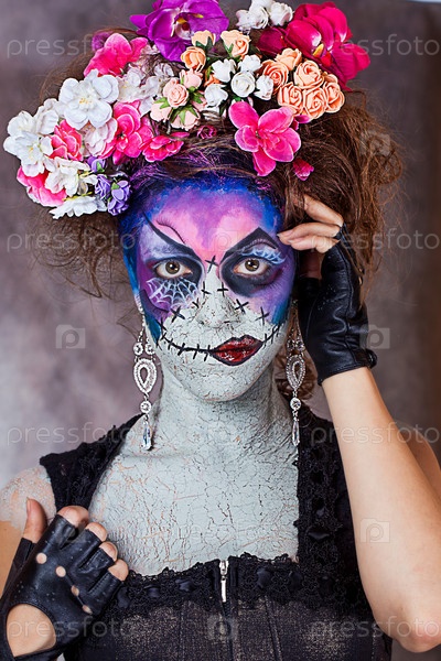 молодая девушка фейс-арт хэллоуин ужас страх праздник цветы