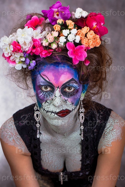 молодая девушка фейс-арт хэллоуин ужас страх праздник цветы