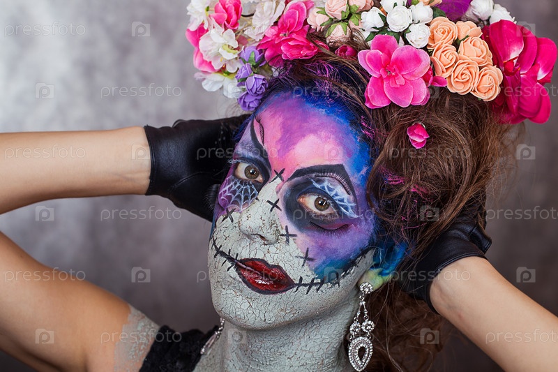 молодая девушка фейс-арт хэллоуин ужас страх праздник цветы