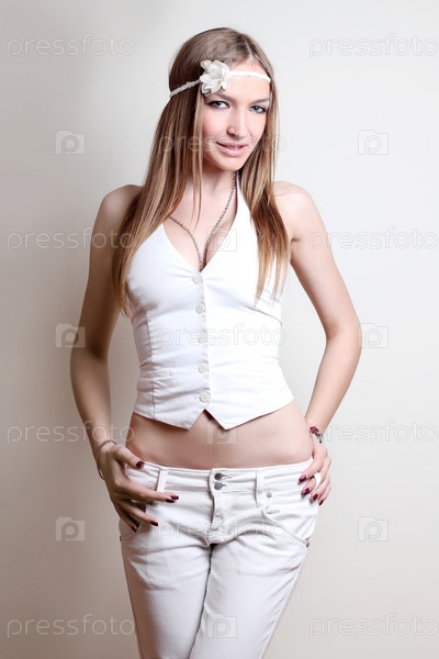Портрет молодой женщины на светло-сером фоне
