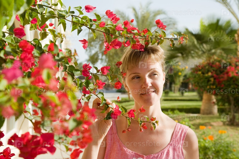 Красивая молодая женщина на фоне цветов