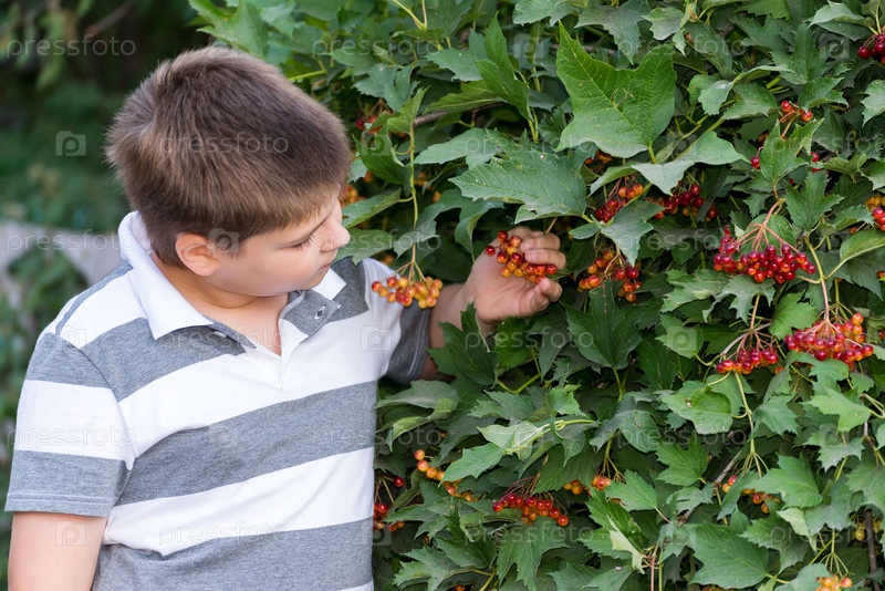 Мальчик изучает ягоды калины