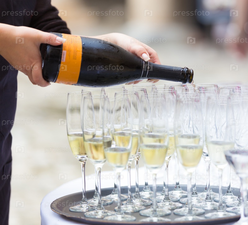 Женщина наливает шампанское в бокалы