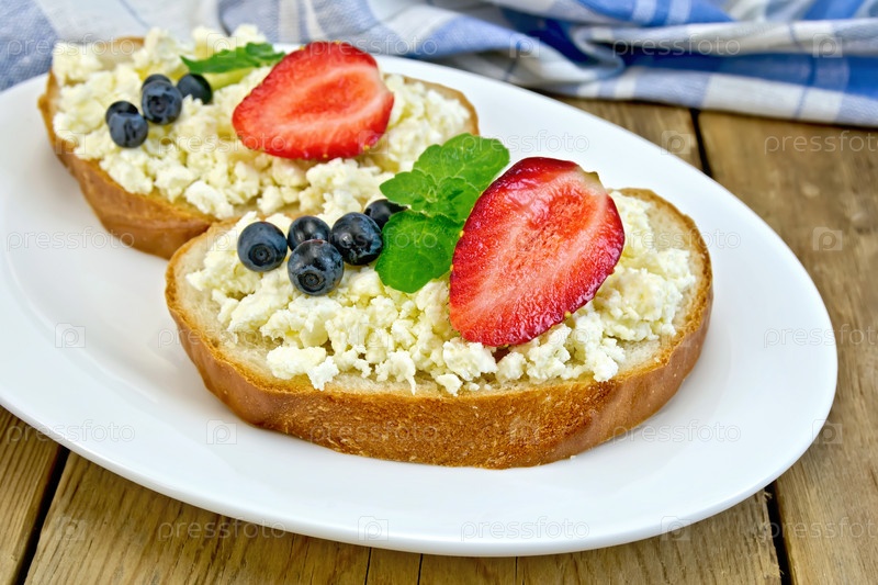 Хлеб с творогом и ягодами в тарелке на доске