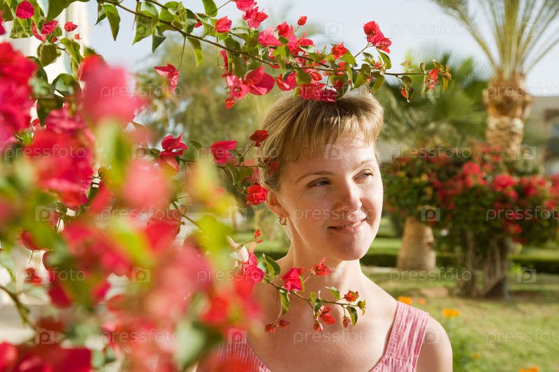 Молодая женщина в цветущем саду